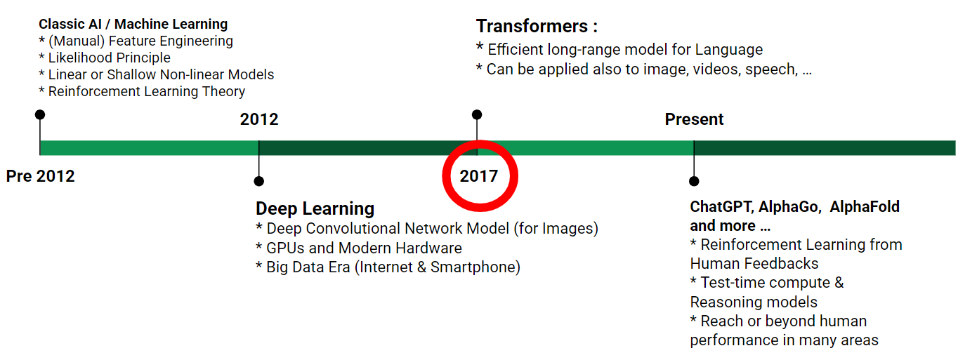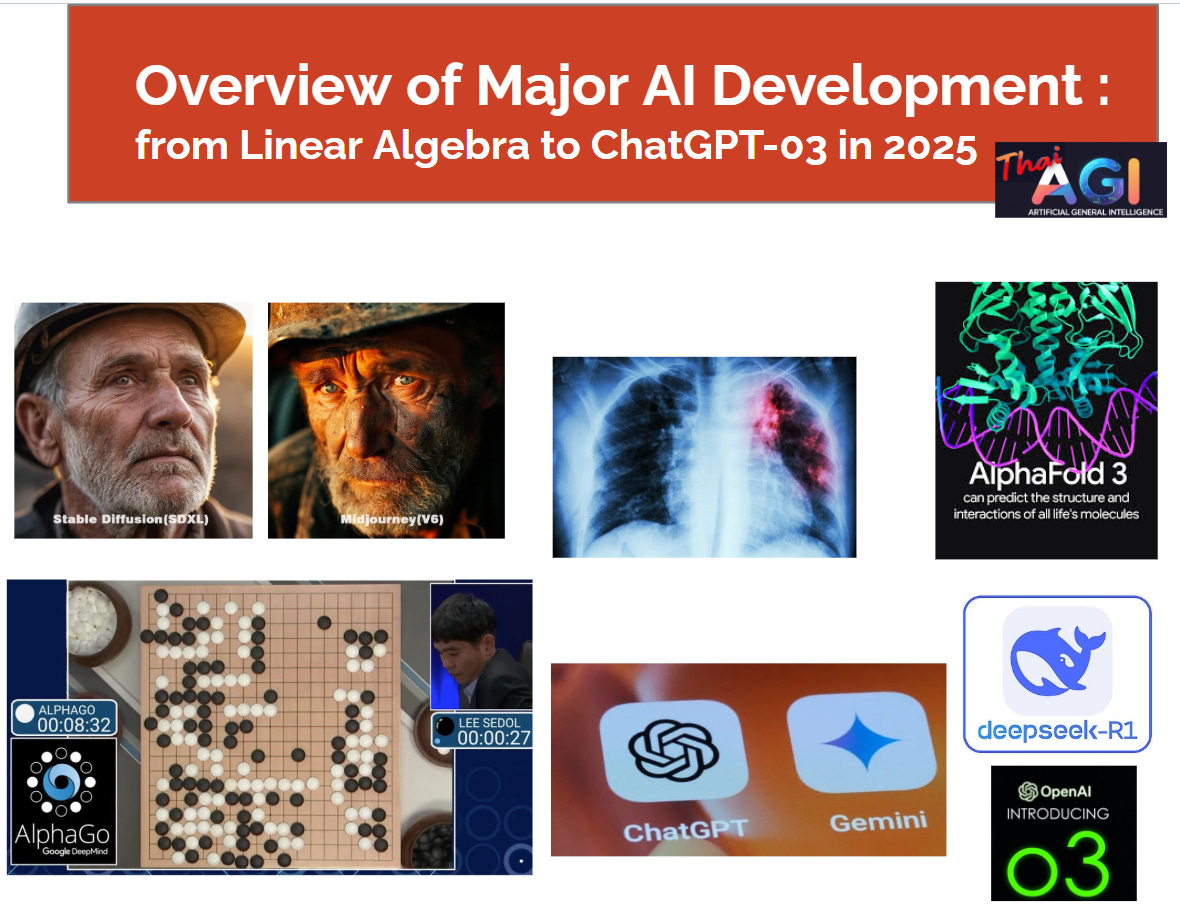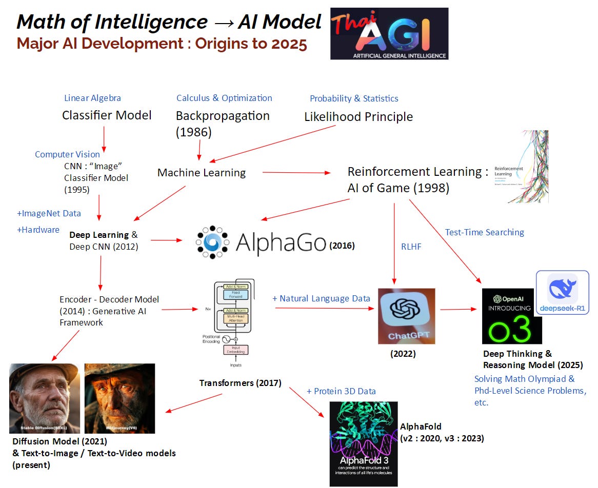 ประวัติย่อของการพัฒนา AI ตั้งแต่คณิตศาสตร์ขั้นพื้นฐานจนถึงโมเดลสุดยอดที่กล่าวมาแสดงอย่างย่อในรูปที่ 5 ครับ