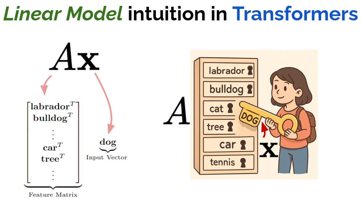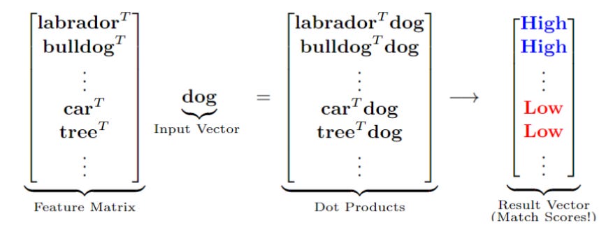 ในตัวอย่างรูปที่ 9 เมื่อ input vector x = dog, และสองแถวแรกของ A คือ labrador และ bulldog จะเห็นว่าเนื่องจากสอง features นี้มีความใกล้เคียง dog ผลลัพธ์ dot-product จึงมีค่าสูง ในขณะที่แถวอื่นๆ ถ้าเป็น features ที่เกี่ยวข้องน้อยเช่น car หรือ tree ผลลัพธ์ dot-product ก็จะมีค่าต่ำเป็นต้น