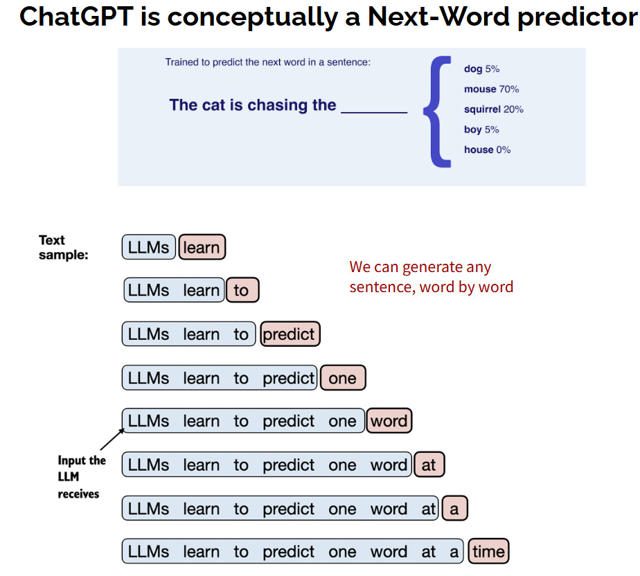 สังเกตว่าในการสร้าง 1 ประโยคมีการทำนายคำ “หลายครั้ง” ทีละคำ แสดงว่าต้องทำ classification หลายรอบ เช่น ตัวอย่างในรูปที่ 10 (ล่าง) ประโยค “LLMs learn to predict one word at a time” มี 9 คำ แสดงว่า Transformers จะต้องแก้ปัญหา Classification 9 รอบ เพื่อสร้างประโยคนี้ เป็นต้น10