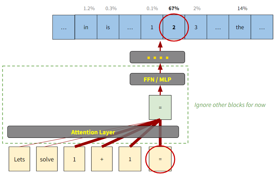 เช่น ถ้าต้องการทำนายคำถัดไปจาก “Lets solve 1 + 1 =”, คำถัดไปจะถูกทำนายจากเวกเตอร์ของคำสุดท้ายคือ “=” เท่านั้น13 ดังแสดงในรูปที่ 12