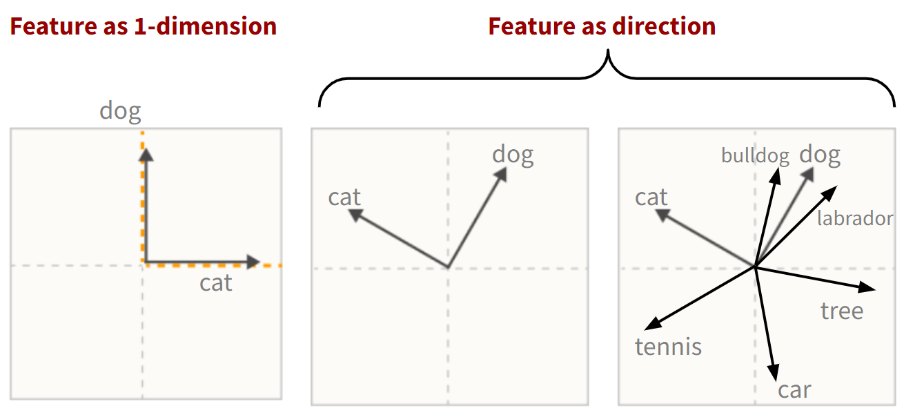 นอกจากนี้สังเกตุว่าไอเดีย “feature as direction” นี้อนุญาตให้เราบีบอัดคำศัพท์ทั้ง 7 คำมาอยู่ใน 2 มิติ แทนที่จะใช้ 7 มิติ ทำให้ประหยัดเนื้อที่ได้ ทำให้แก้ข้อเสียของ “feature-as-dimension” ทั้งสองข้อได้5