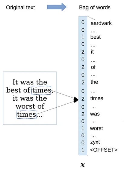 อย่างไรก็ดีเราลองมาดู ความพยายามของ AI ในอดีต ที่พยายามทำความเข้าใจภาษากันครับ ไอเดียง่ายๆ ที่ AI สมัยก่อนใช้ในการสร้าง features จาก text document ก็คือการ “นับคำ” ดั่งแสดงในรูปที่ 5 ครับ