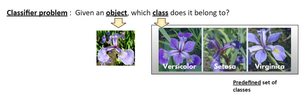 ปัญหาจำแนกประเภท (Classification) มีโจทย์คือ “จงพิจารณาวัตถุที่กำหนด แล้วบอกว่าวัตถุนั้นจัดเป็น “ประเภท” (class) ใด”