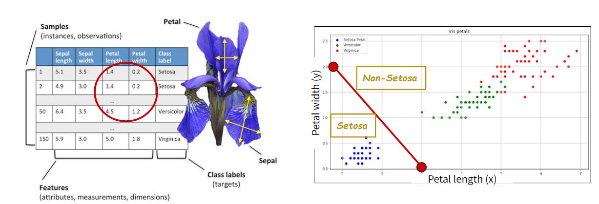 “ความกว้าง” และ “ความยาว” ของกลีบดอกที่มนุษย์วัดตัวเลขมานี้ ถ้าเรามาพลอตในแกน xy ดังรูปที่ 3 (ขวา) สังเกตว่าเราสามารถ “ลากเส้นตรง” แบ่งระหว่าง Setosa กับอีกสองสายพันธุ์ได้ และเราก็สามารถลากเส้นคล้ายๆ กันแบ่งระหว่างอีกสองสายพันธุ์ได้เช่นกัน1